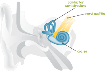 L’oïda mitjana és una cavitat, com ara un cigró, que està separada de l’oïda externa per una membrana fina com un paper de fumar. Aquesta membrana és el timpà. A continuació hi ha tres ossets molt petits que es diuen martell, enclusa i estrep. Quan el so topa amb la membrana, o sigui amb el timpà, aquest vibra i posa en moviment la cadena d’ossets, que transmeten el so a l’oïda interna. La pressió de l’aire a l’oïda mitjana és igual a la pressió de l’aire de l’ambient exterior, la qual cosa permet la vibració. L’aire entra en aquesta part de l’oïda a través de les trompes d’Eustaqui, que la connecten amb la part posterior del nas. De vegades, quan fas un badall i sents un petit soroll dins de l’orella, és perquè la trompa d’Eustaqui ha enviat una petita bombolla d’aire per igualar la pressió. Per què fan mal les orelles quan s’enlaira o aterra un avió? Quan la pressió de l’aire a l’oïda mitjana i externa no són iguals, pots notar dolor o tenir la sensació que no sents prou bé. És el que passa de vegades quan anem en avió i s’enlaira o aterra, o bé quan pugem o baixem muntanyes. Per què tenim cera-cerumen a les orelles? A l’oïda externa també és on es fabrica la cera, aquesta particular massa que se’ns fa a les orelles, que està formada de substàncies químiques especials que combaten les infeccions i ajuden a mantenir net el conducte auditiu. |