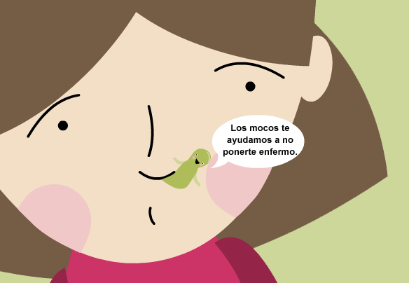 Los mocos son una sustancia espesa, viscosa y pegajosa que normalmente sale de nuestra nariz. Son una barrera para nuestro cuerpo. Ellos impiden que nos entren por los agujeros de la nariz elementos que nos podrían hacer enfermar como, por ejemplo, el polvo.